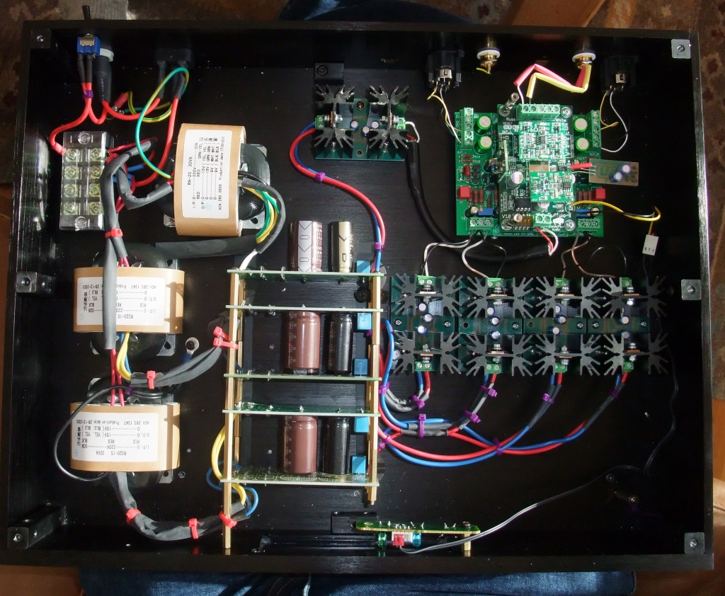 Likeretting og pre-regulering med ultraraske likeretterdioder; elektrolyttkondensatorer fra Elna og Black Gate, samlet over 18000uF