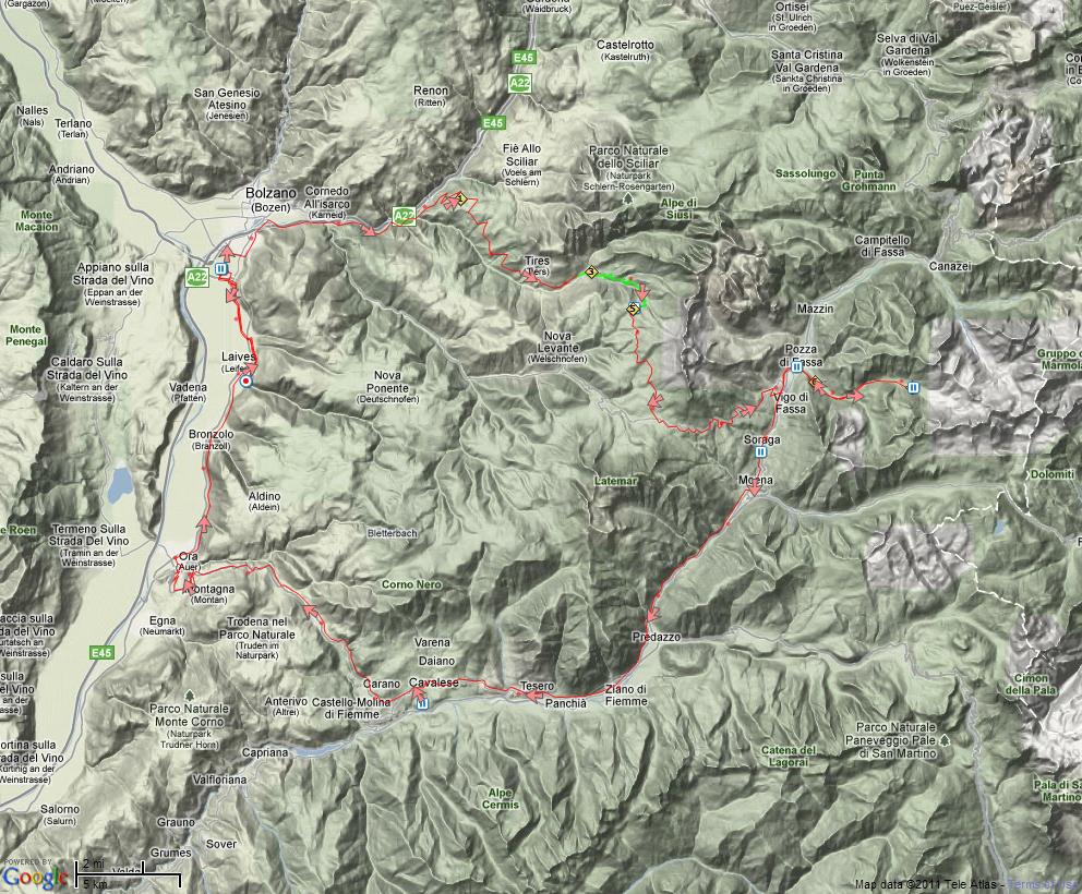 Tuesday 2. August. Two time stretches today, and both were steep at times (up to 20%). The first (marked in green) was up to Passo Nigra, the second from Pozzo di Fassa up Val S. Nicolo. ![]() Terje taking a short rest after the first time stretch ![]() Rest after the second time stretch in beautiful Val S. Nicolo