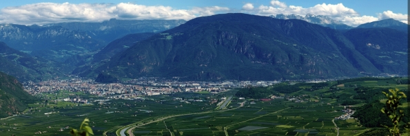 Ruten går opp bakken fra venstre del av bildet opp mot høyre, forbi de grønne jordene og ned på høyre side. Bolzano i forgrunnen til venstre: