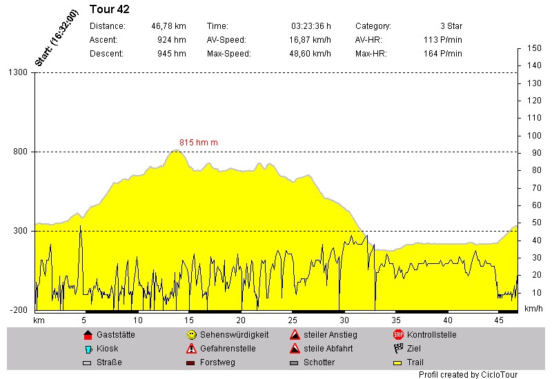 Høydeprofil. Toppen ved 815 m er en avstikker opp til Stav. Trykk på bildet for større versjon
